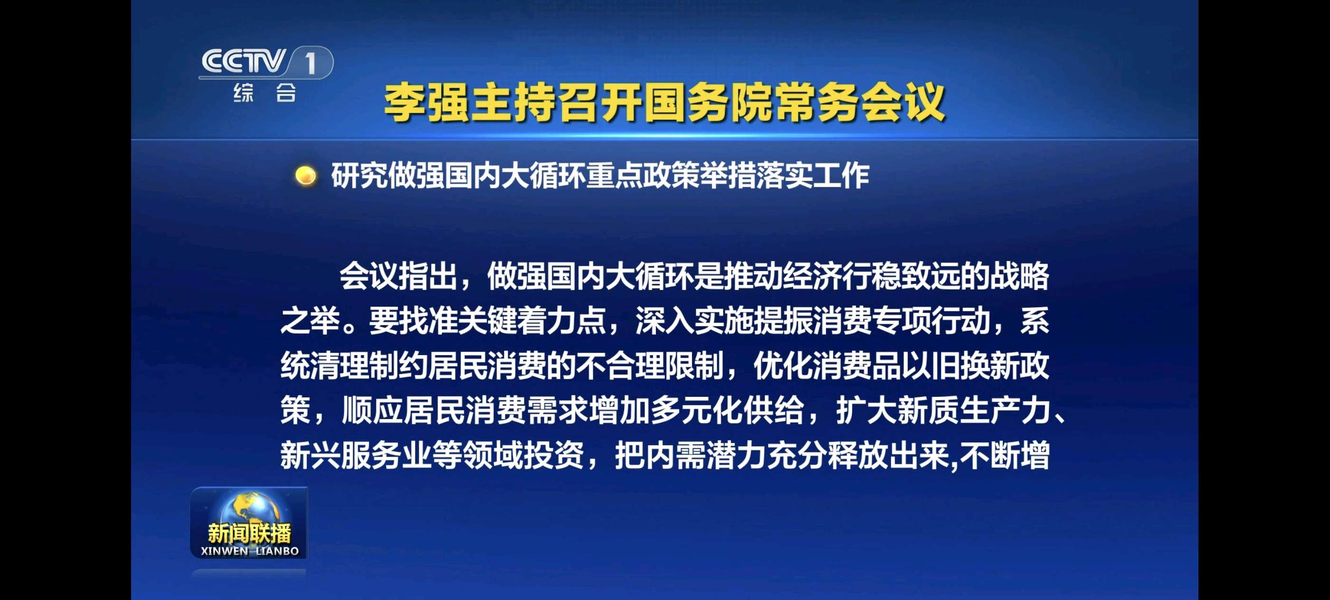 李强主持召开国务院常务会议,研究做强国内大循环重点政策举措落实工作。会议指出,做强国内大循环是推动经济行稳致远的战略之举。要找准关键着力点,深入实施提振消费专项行动,系统清理制约居民消费的不合理限制,优化消费品以旧换新政策,顺应居民消费需求增加多元化供给,扩大新质生产力、新兴服务业等领域投资,把内需潜力充分释放出来,不断增强国内大循环内生动力。要聚焦突出问题,提高政策精准度和可操作性,加强部门间协同配合,汇聚政策落实的合力,加快破解制约国内大循环的堵点卡点。有关部门要进一步优化政策设计,认真听取各方面意见建议,积极帮助地方和企业解决困难、促进发展,齐心协力推动经济持续向好。(央视)